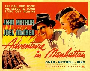 The delicious 1936 screwball comedy thriller film Adventure in Manhattan stars Jean Arthur, Joel McCrea, Thomas Mitchell, and Reginald Owen.