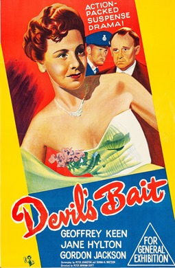 The attractively odd, fascinating little 1959 British B-movie drama film Devil’s Bait stars Geoffrey Keen, Jane Hylton and Gordon Jackson. It is something completely different, mixing suspense thriller with dark comedy.