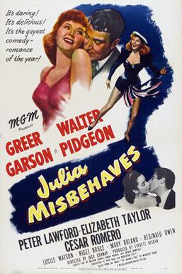 MGM’s 1948 romantic comedy film Julia Misbehaves stars Greer Garson and Walter Pidgeon in the sixth of their nine films. Elizabeth Taylor turned 16 during filming and gets her first onscreen kiss, from Peter Lawford, whom she pursued romantically.