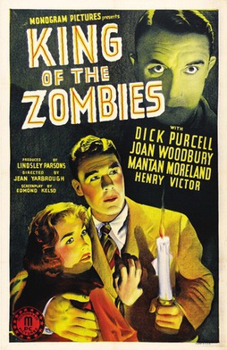 Monogram Pictures’ 1941 zombie comedy horror B-film King of the Zombies stars Dick Purcell, Joan Woodbury, Mantan Moreland, and Henry Victor as Dr Miklos Sangre who controls zombies through voodoo.