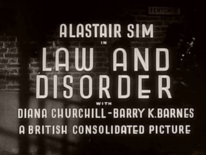 The 1940 British comedy crime film Law and Disorder, in which a young solicitor who defends a number of petty criminals is accused of sabotage, stars Alastair Sim, Diana Churchill, Barry K Barnes, Edward Chapman and Austin Trevor.