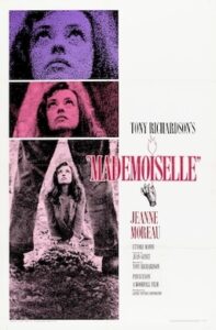 Jeanne Moreau stars in director Tony Richardson’s 1966 black and white psychological thriller film Mademoiselle as a schoolteacher in a French village, a sexually repressed sociopath obsessed with virile Italian logger Manou (Ettore Manni).