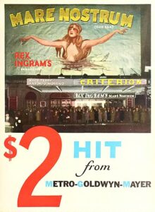 Rex Ingram’s reputation rested on the huge success of his 1921 film The Four Horsemen of the Apocalypse, an adaption of Vicente Blasco Ibáñez’s work. Ingram was determined to adapt another Ibáñez work, his 1918 novel Mare Nostrum, ‘an epic tale of World War I espionage and naval battles’. Luckily, The Four Horsemen of the Apocalypse had saved Metro Pictures from bankruptcy, and earned the director the undying gratitude of the head of Metro, Marcus Loew, the man who formed MGM on April 17, 1924 by combining Metro Pictures, Goldwyn Pictures, and Louis B Mayer Pictures into one company. So Ingram was able to purchase the former Gaumont studio located in Nice, France, financed by MGM and requiring extensive upgrades before making Mare Nostrum.