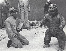 Director of special effects Sadamasa Arikawa instructs Marchan the Dwarf (Minilla).