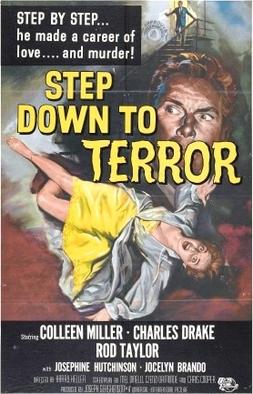 Director Harry Keller’s 1959 Universal International Pictures film noir crime thriller Step Down to Terror [The Silent Stranger] is based on the story Uncle Charlie by Gordon McDonnell, and stars Colleen Miller, Charles Drake, Rod Taylor, Josephine Hutchinson, and Jocelyn Brando, along with Alan Dexter, Ann Doran, and Rickey Kelman.