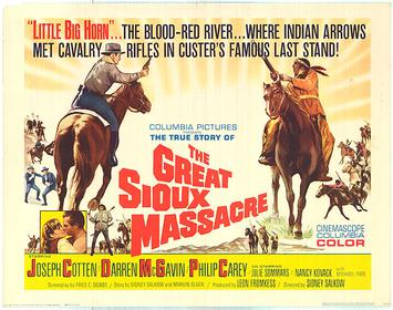 The Great Sioux Massacre [Custer Massacre] is directed by Sidney Salkow, runs 102 minutes, is made by Leon Fromkess – Sam Firks Productions, is released by Columbia Pictures, is written by Marvin A Gluck (credited Fred C Dobbs), based on a story by Sidney Salkow and Marvin A Gluck (credited Marvin Gluck), is shot in CinemaScope by Irving Lippman, is produced by Leon Fromkess, and is scored by Emil Newman and Edward B Powell.