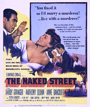 The 1955 crime-romance film noir The Naked Street stars Farley Granger as a young punk involved in ugly crimes and a doomed romance the sister (Anne Bancroft) of a crazed New York gangster (Anthony Quinn).