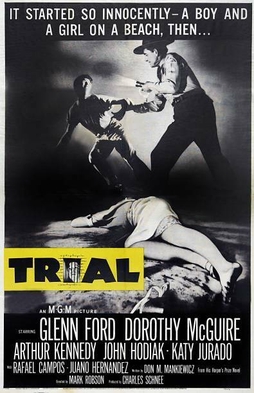 The 1955 American black and white film Trial stars Glenn Ford, Dorothy McGuire, Arthur Kennedy, John Hodiak, and Katy Jurado in the story of a rape-murder trial where a Mexican-American teenager is accused of the death of a Caucasian girl.